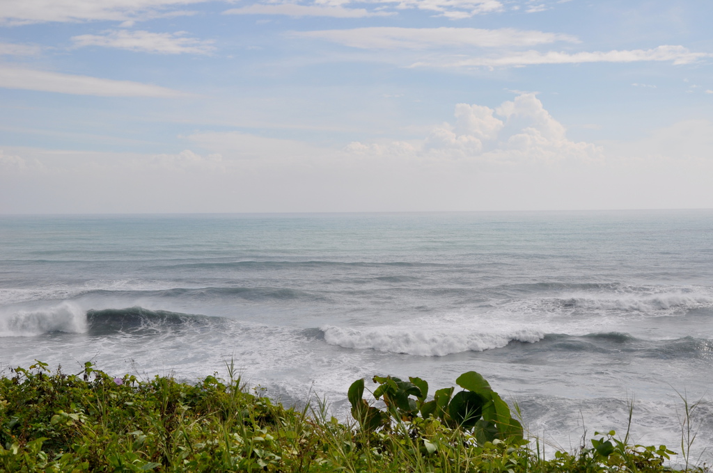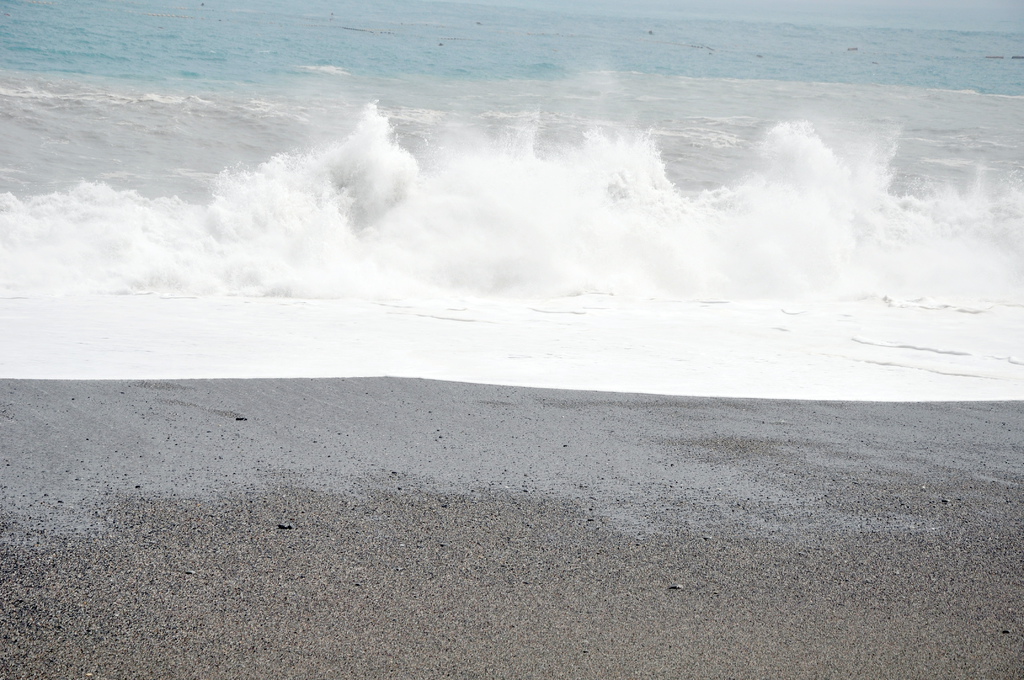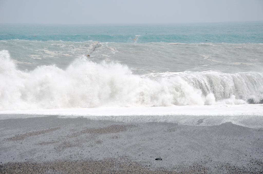 則颱風造成的長浪波波襲擊海岸的景象,